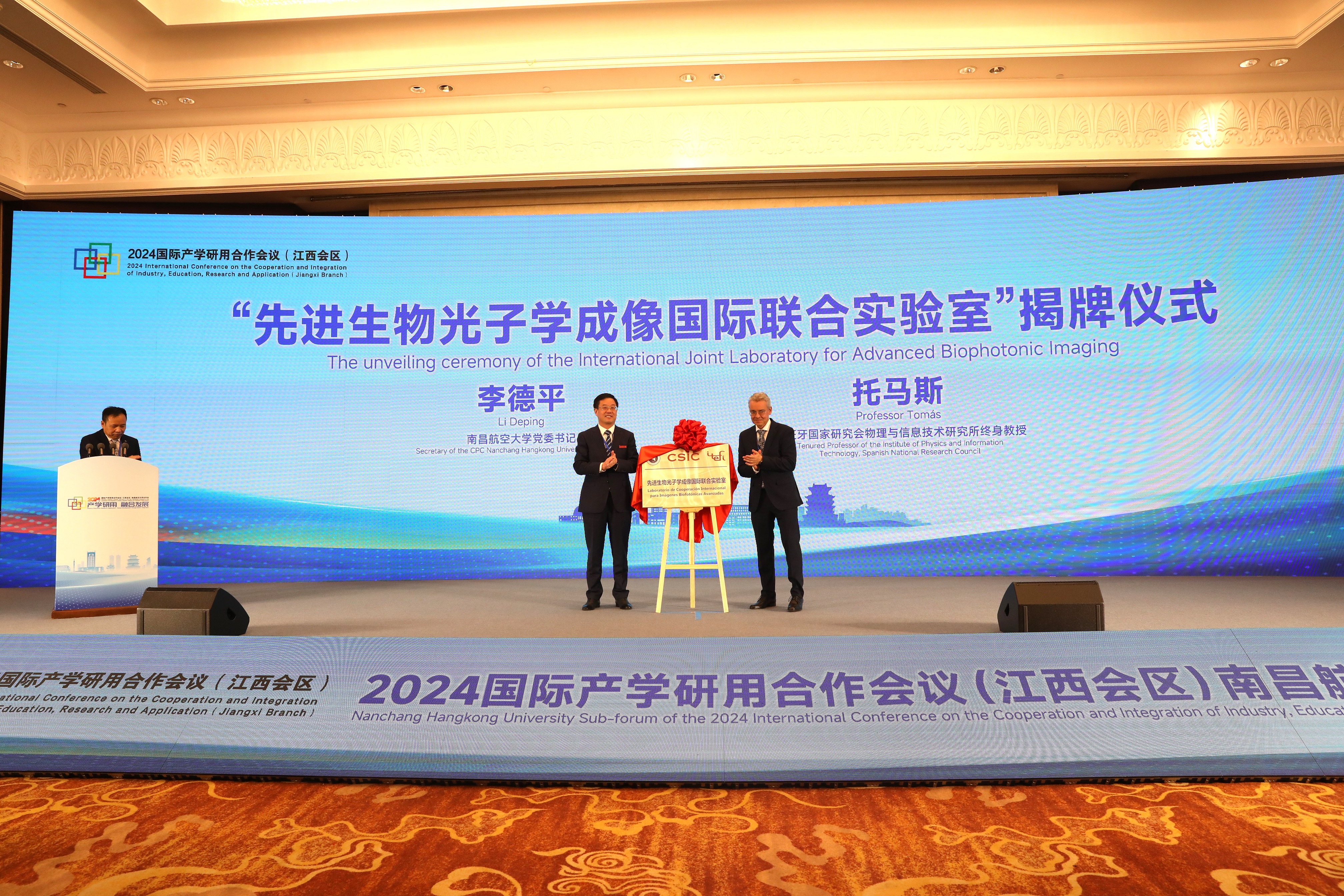会上,我校党委书记李德平与西班牙国家研究会物理与信息技术研究所终身教授托马斯共同为“先进生物光子学成像国际联合实验室”揭牌。该实验室的建立,将为双方在先进生物光子学成像领域的研究提供有力支持,推动双方在科技创新方面的深入合作。